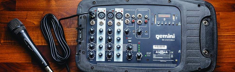 ES-210MXBLU-ST Portable PA System. To top it all off you get 10 Low-Frequency woofers with a 2 voice coil. Some serious power comes from each speaker 600W peak. Buy Gemini Sound ES-210MXBLU-ST Professional Audio Bluetooth PA System with Two 10 Woofer Speakers and Microphone Included Detachable 8 Channel Mixer 4 LineMic Inputs SD USB wSpeaker Stands Set. Music on the Go The ES-210MXBLU Portable PA System is designed to give you a true taste of fantastic sound without the unnecessary bulk. With features including an eight channel mixer integrated USB Bluetooth and SD interfaces and convenient built in storage its the perfect solution for those looking for a truly compact portable PA system. Gemini ES-210MXBLU-ST Portable PA System The Gemini ES-210MXBLU-ST is filled with innovative technology in one complete lightweight package.