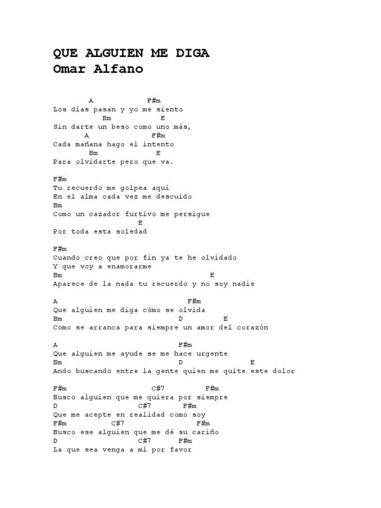Que alguien me diga Como se olvida Como se arranca para Siempre un amor del corazón Que alguien me ayude Se me hace urgente. Y que voy a enamorarme. Que alguien me diga como se olvida como se arranca para siempre un amor del corazon.